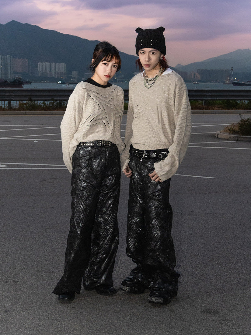 Star cutout lazy mid-length off-shoulder knitted sweater
